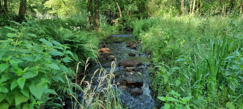 Het eerste gedeelte, samen met een groot gedeelte van de route verkorter, liepen we verhard (asfalt). Pas aangekomen bij het Kievietsveld (een mooi meer waar je kunt suppen & waterskien) mogen we over een smal onverhard paadje verder. Zeker wanneer we het meer achter ons laten en langs een mini waterval lopen volgt een stuk waar je je echt even weg van alles waant. Langs een beekje vliegen allemaal blauwe libellen, we telden wel een stuk of 10, bijzonder!