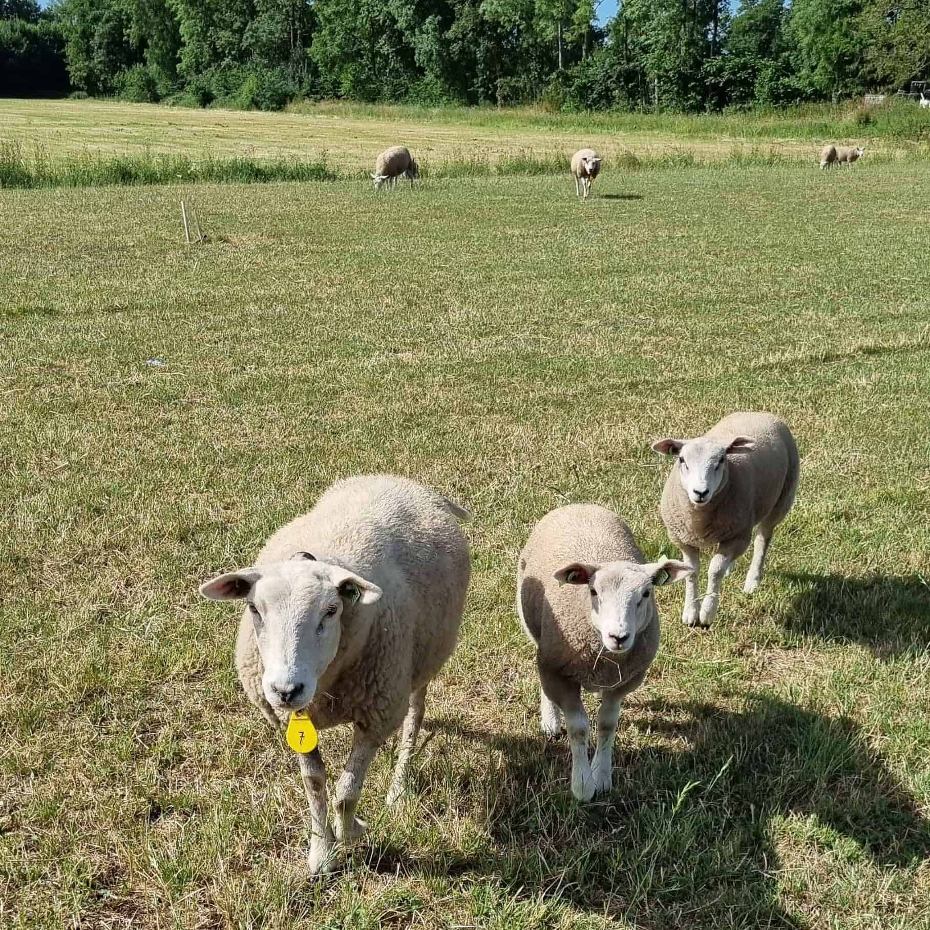 Eventjes verderop kwam dit moederschaap met haar, inmiddels al flink gegroeide, lammeren even hallo zeggen. We lopen langs ‘t Smallert en twijfelen of we er even iets willen drinken maar besluiten door te lopen voordat het echt te warm wordt. Onze kleine meid van 9 maanden slaapt nog in de draagzak, dus dat benutten we om nog wat stappen te zetten.
